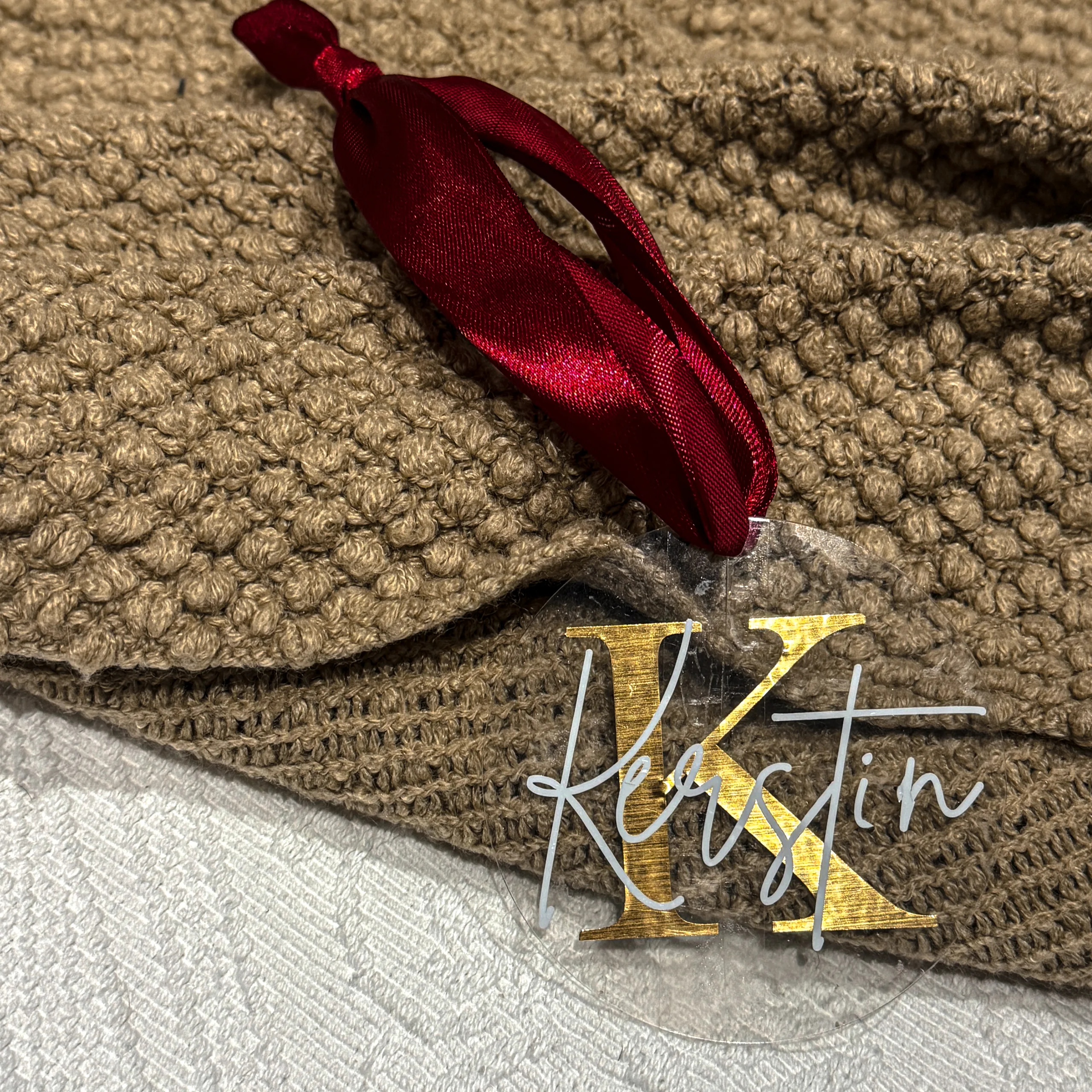 Personalize your holiday decor with our custom name ornament featuring a gold initial, white name, and a festive red ribbon.